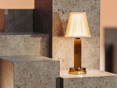 Each Manhattan lamp is CNC-milled from solid brass, polished to a smooth finish, and left unlacquered so it will age gracefully with time and use. The column features subtle vertical fluting that nods to art-deco skyscraper architecture, while the overall proportions keep the lamp compact enough for tabletop use. Despite its refined appearance, Manhattan is engineered for professional environments, where durability and serviceability are essential. Shade options include natural cotton and hand-pleated silk for a soft, classic finish, or ribbed glass in amber, frosted, or green for a bolder statement. Each material affects the way light is diffused, allowing designers to tailor the lamp to the atmosphere of a space. The result is a cordless lighting solution that is both practical and decorative—elevating tables, bars, and lounges with elegance that never feels overstated.