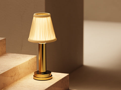 The Victoria collection brings together classic form and contemporary utility. Each lamp features a solid brass base—CNC-machined for precision and weight—and is paired with a shade designed to diffuse light softly while delivering a clear, downward beam. The proportions are deliberately balanced: tall enough to feel elegant, compact enough to sit comfortably on dining tables and sideboards. Finishes include polished lacquered brass, aged brass with a living patina, and a striking 18K gold-plated option. Shade styles range from natural cotton and hand-pleated silk to ribbed glass, with subtle variations in colour and translucency. A stitched leather sleeve is also available for added texture and warmth. Victoria suits a wide range of applications, from restaurant table lighting and boutique hotels to quiet corners at home. It is part of NEOZ’s most design-focused group of cordless lamps—created for interior designers and hospitality professionals who want atmosphere, flexibility, and reliable wireless lighting that lasts.